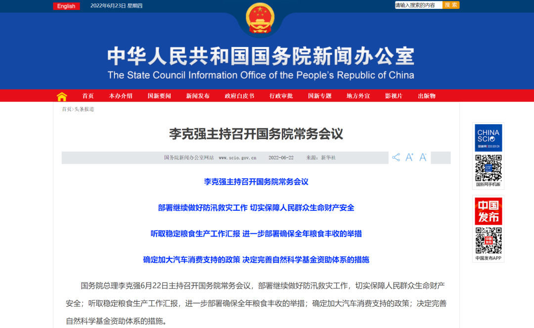 国务院总理李克强6月22日主持召开国务院常务会议,部署继续做好防汛救灾工作,切实保障人民群众生命财产安全;听取稳定粮食生产工作汇报,进一步部署确保全年粮食丰收的举措;确定加大汽车消费支持的政策;决定完善自然科学基金资助体系的措施。